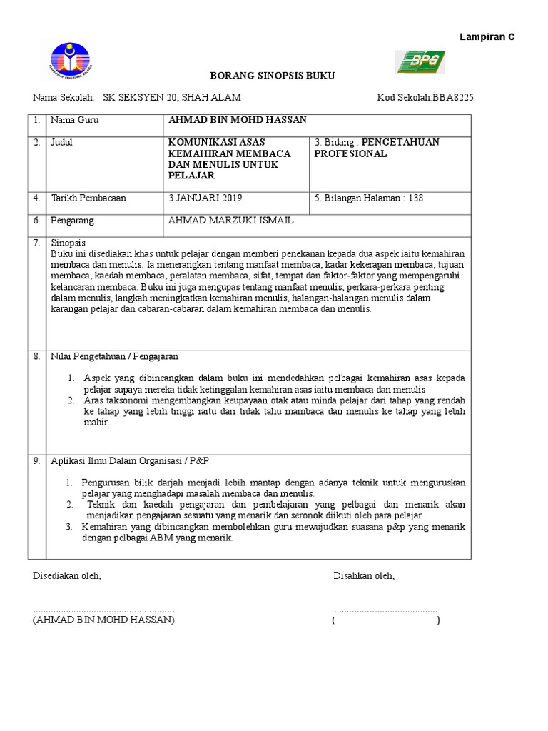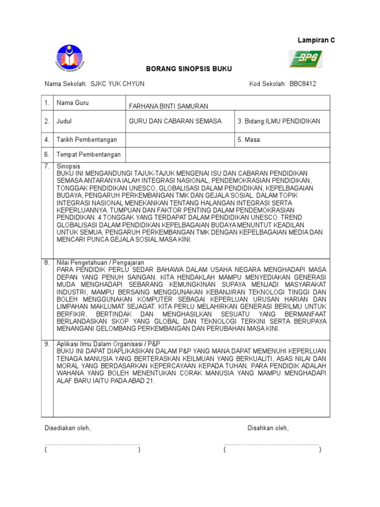 Lampiran c borang sinopsis buku nama sekolah. ISBN 978-967-61-26405-5 ULASAN Buku setebal 113 halaman ini telah dihasilkan oleh penulis yang arif dalam dunia pendidikan iaitu Dr. Sinopsis buku splkpm contoh book review e splg pdf doc ldp ulasan video.